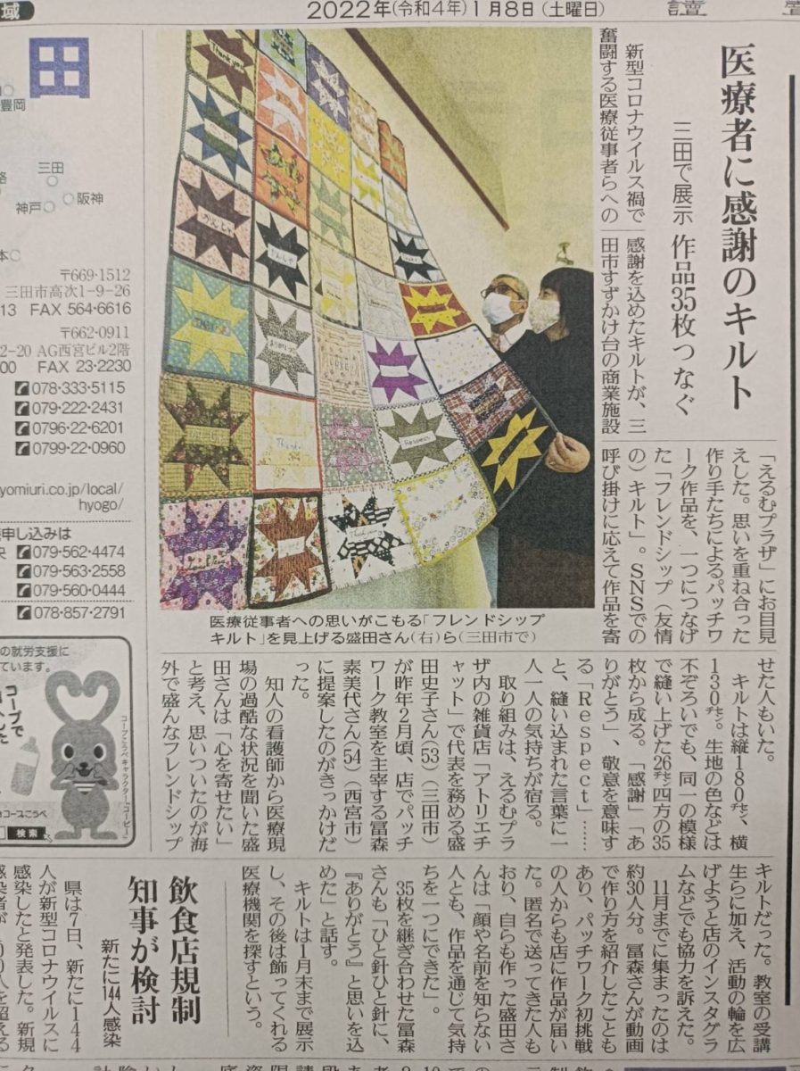 昨年パッチワーク倶楽部の冨森先生と立ち上げた 医療従事者の方々への感謝の意を込めた
