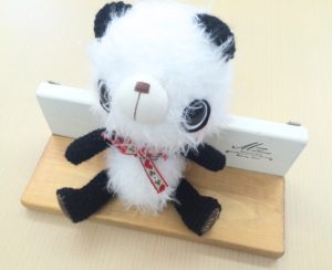 私はMinoです。この商品はふわふわぱんだちゃんといい、値段は2200円です。サイズは横16㎝、高さ19㎝です。作った方は、Aichan-Clubさんです。白い部分と黒い部分の毛糸は違いますが、すべてハンドメイドです。このふわふわな生地は、思わず抱きしめたくなります。目と鼻の位置が逆になっていることで、普通のぱんだよりも面白く、可愛らしくなっています。また、目と鼻の位置が逆になっていることや、口がないこと、ほっぺがピンク色になっていることで、ぱんだが恥ずかしがっている様子になっています。