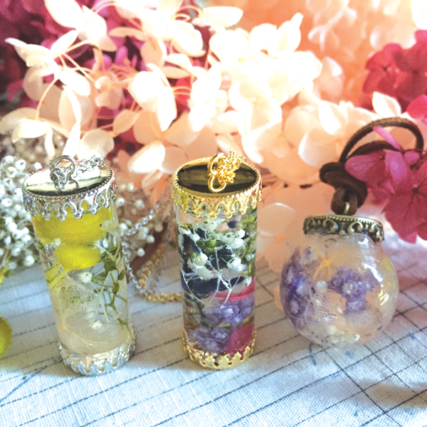 小さなガラス瓶に花材を入れて植物標本を作ります。ドライフラワー、ハーバリウム専用オイルは日本製です。